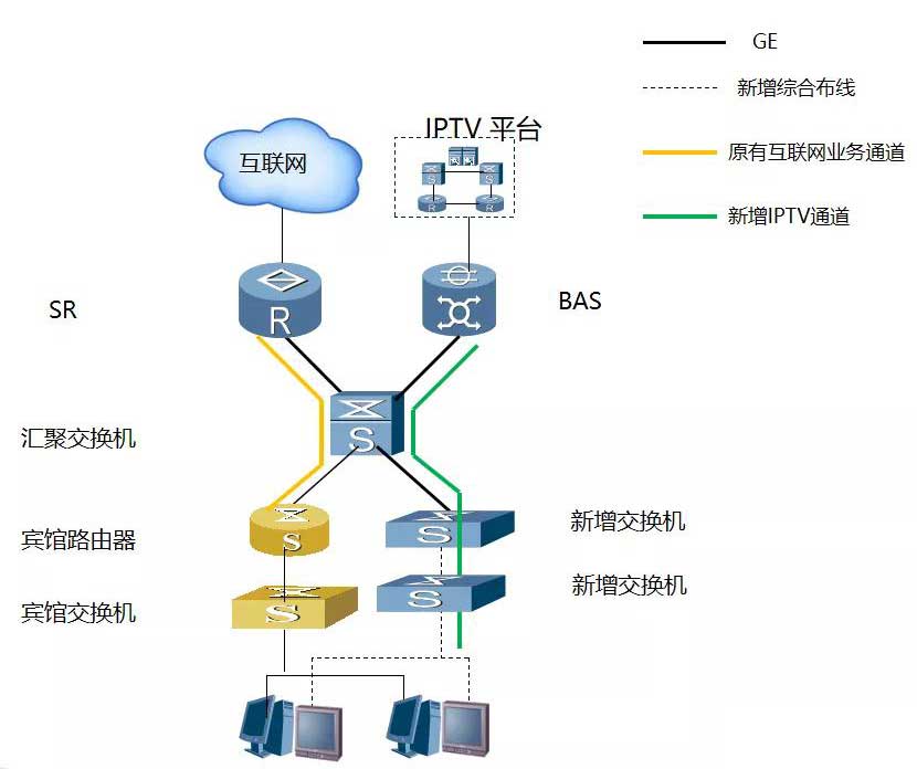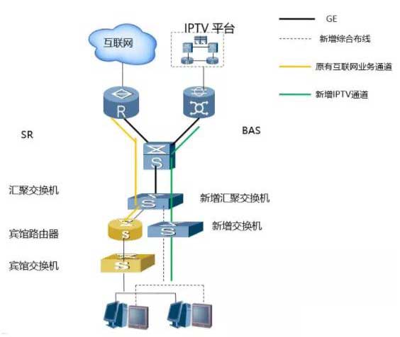 1、為賓館新增出口千兆匯聚交換機(jī)1臺;將用戶原有的100M鏈路調(diào)整為千兆鏈路【原有專線未在局端匯聚交換機(jī)接入的,需要調(diào)整鏈路到匯聚交換機(jī)】,同時(shí)承載寬帶專線和IPTV業(yè)務(wù)VLAN,寬帶業(yè)務(wù)VLAN透傳至SR承載,IPTV業(yè)務(wù)VLAN透傳至BAS承載,新增匯聚交換機(jī)下聯(lián)端口分別連接賓館路由器和接入交換機(jī);