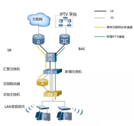 4、賓館客房配套安裝橋接型家庭網(wǎng)關(guān)設(shè)備,上聯(lián)端口接入原有綜合布線,透傳IPTV業(yè)務(wù)VLAN與寬帶業(yè)務(wù)VLAN,LAN口1接入寬帶業(yè)務(wù),LAN口4接入IPTV機(jī)頂盒,并可以選擇支持WIFI功能的型號,增加賓館WIFI覆蓋;