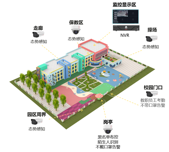 在大型傳染性疾病傳播的非常時期,通過不帶口罩告警,也可對一些不帶口罩頑固分子起到監(jiān)督管控作用,保障幼兒園園區(qū)公共安全衛(wèi)生。